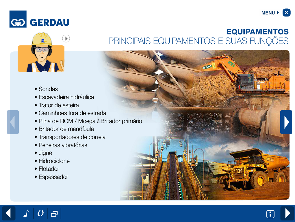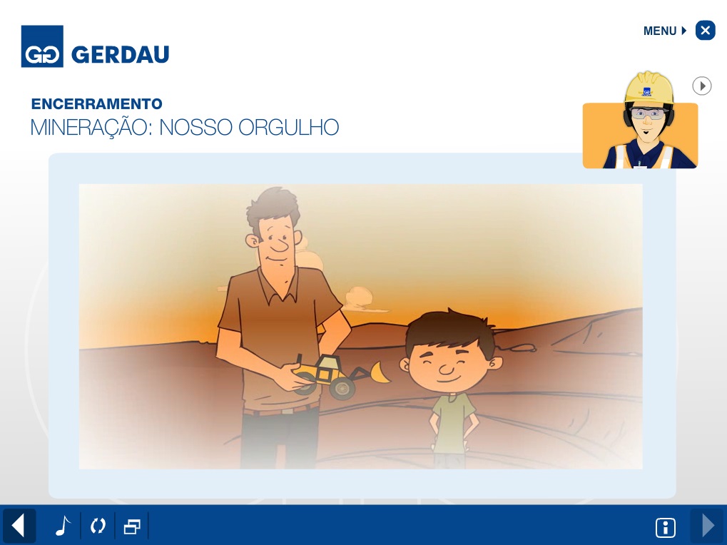 Concebido com o objetivo de ser o primeiro contato dos novos colaboradores com as informações necessárias à execução segura da atividade mineiradora, o Programa de Integração da Mineração Gerdau baseou-se nos quesitos determinados pela NR 22, além dos temas de cunho institucional e administrativo que enriqueceram ainda mais o treinamento. A mídia desenvolvida tornou o programa de integração mais interativo e dinâmico e trouxe para os participantes a oportunidade de exercitar no ambiente virtual várias situações presentes no dia a dia da mineração.